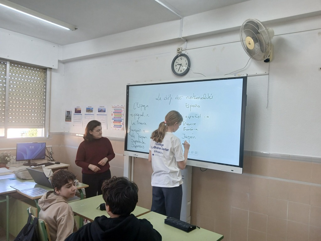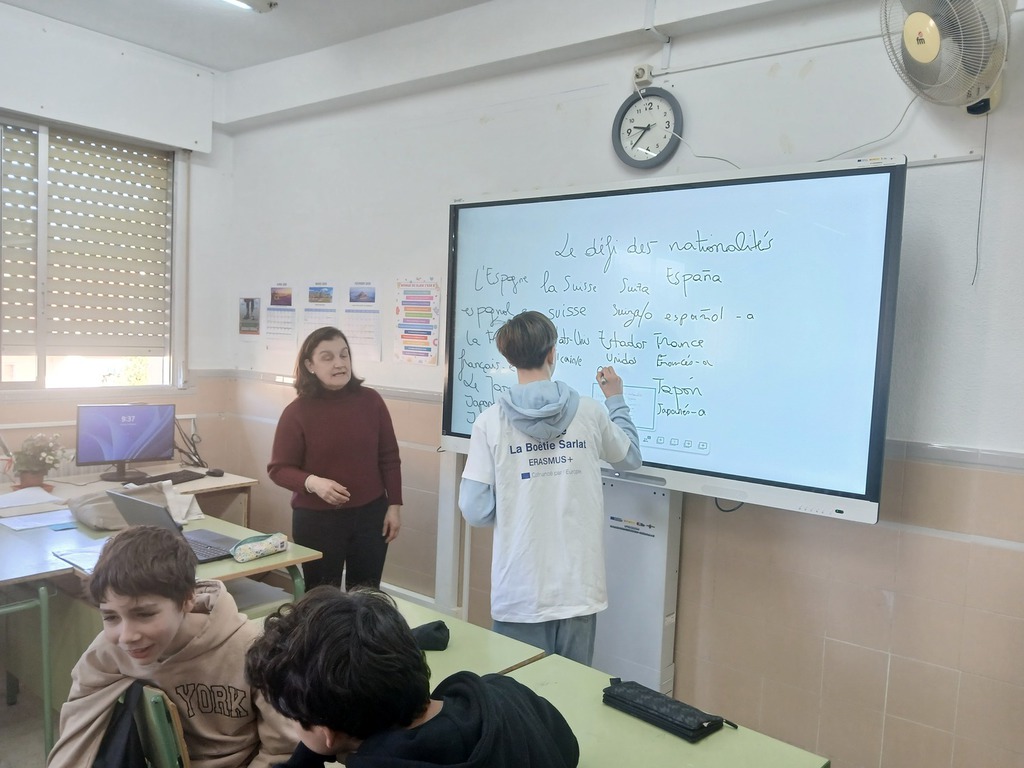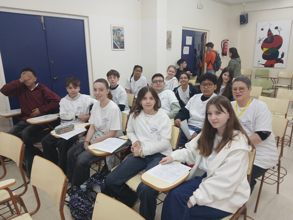 De 8h15 à 14h15, nous étions dans l’établissement qui recevait également des italiens. Des badges nous ont été distribués pour faciliter l’identification et le pays d’origine. Nos élèves ont assisté à des activités communes mises en place par les enseignants espagnols pour les sensibiliser à la citoyenneté européenne. Ensuite, les élèves ont assisté à différents cours, c’était le début de l’immersion linguistique. A la fin des cours, nos élèves sont rentrés avec leurs correspondants dans les familles.