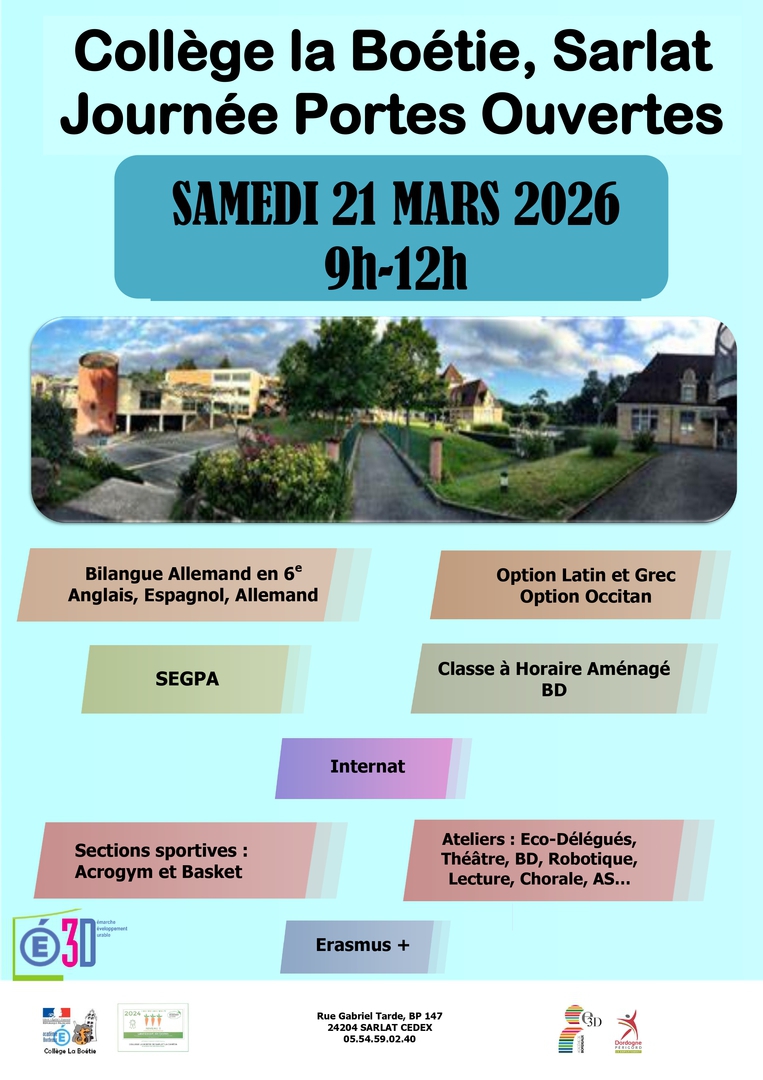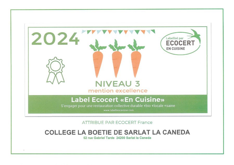 Ce label se décline en quatre niveaux : Niveau 1, Niveau 2, Niveau 3, et Niveau 3 avec mention Excellence. Le collège La Boétie a obtenu, pour la troisième année consécutive, le label Niveau 3 Excellence.