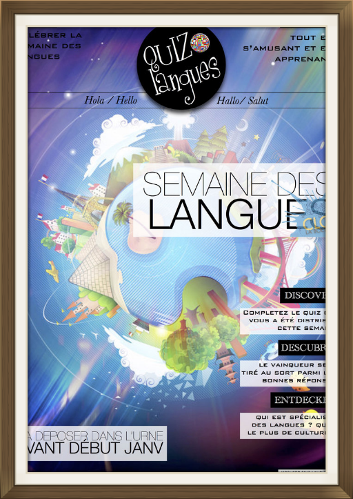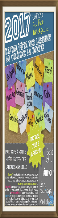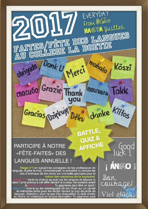 Enfin, afin de pousser les élèves et le personnel du collège à la réflexion, un quiz sur les langues a été proposé à l’ensemble des acteurs du collège. Ce quiz portait aussi bien sur la culture, la politique et la langue des pays dont la matière est enseignée dans l’établissement. Le vainqueur a remporté également un prix décerné par le FSE.