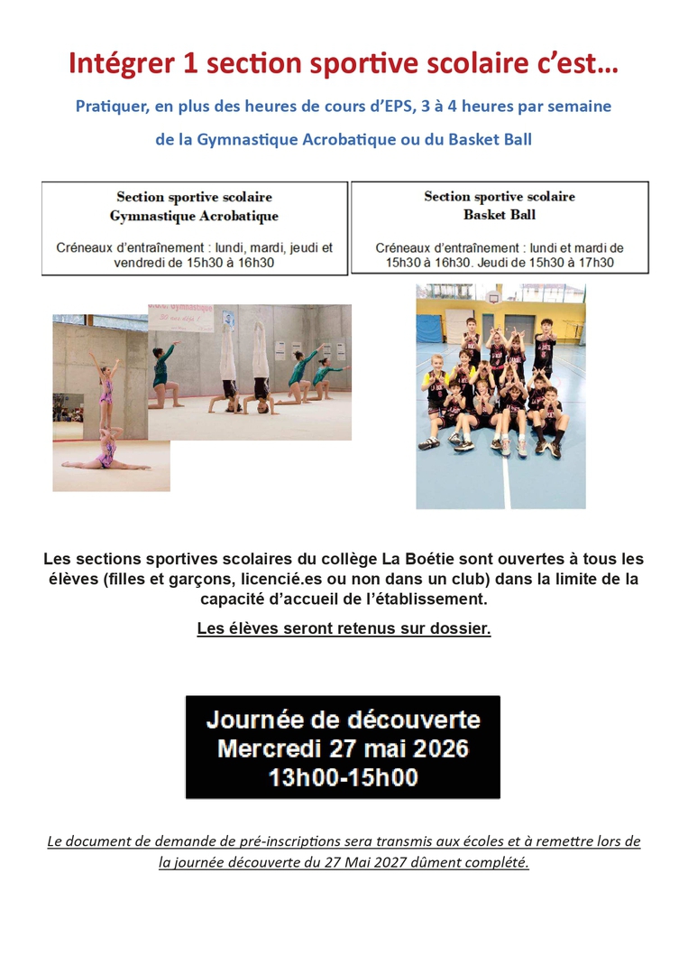 Le collège La Boétie propose deux sections sportives : Acrogym et BAsket